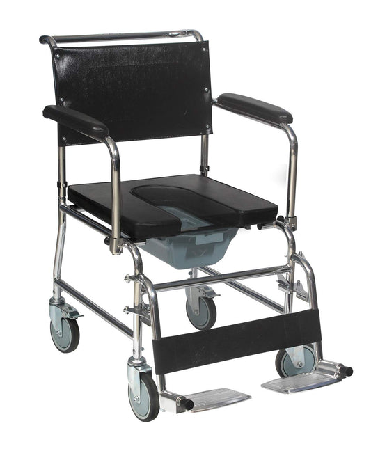 Rolling Commode Chair U-Cut Seat with Removable Pot | Chrome Steel Frame | Lightweight Portable Durable Wheelchair | Flip Down Armrest | Detachable Legrest | 5'' Castor Wheels Rear With Brake